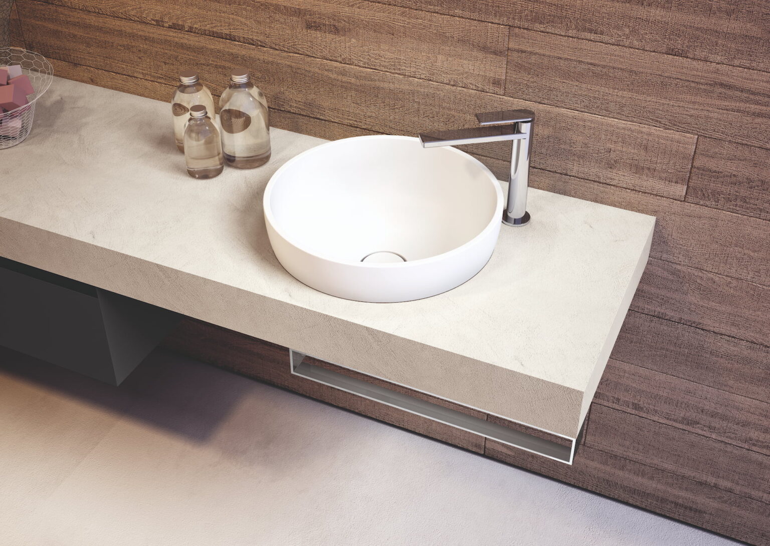 Встраиваемая сверху раковина Bacinella из белого матового Aquatek, без перелива, в комплекте с постоянно открытым сливом в отделке. Доступна для линейных столешниц.