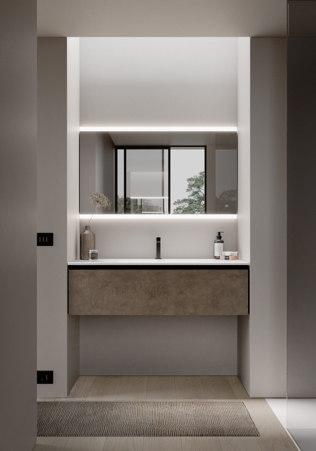 Зеркало Dual Touch со встроенным верхним и нижним светодиодным освещением, сенсорным управлением Touch on/off и системой смены интенсивности 2 700/6 000 К. Без возможности подключения розетки и выключателя. IP44 — 4 000 K. Вт от 13 до 35 – Лм от 830 до 2 160