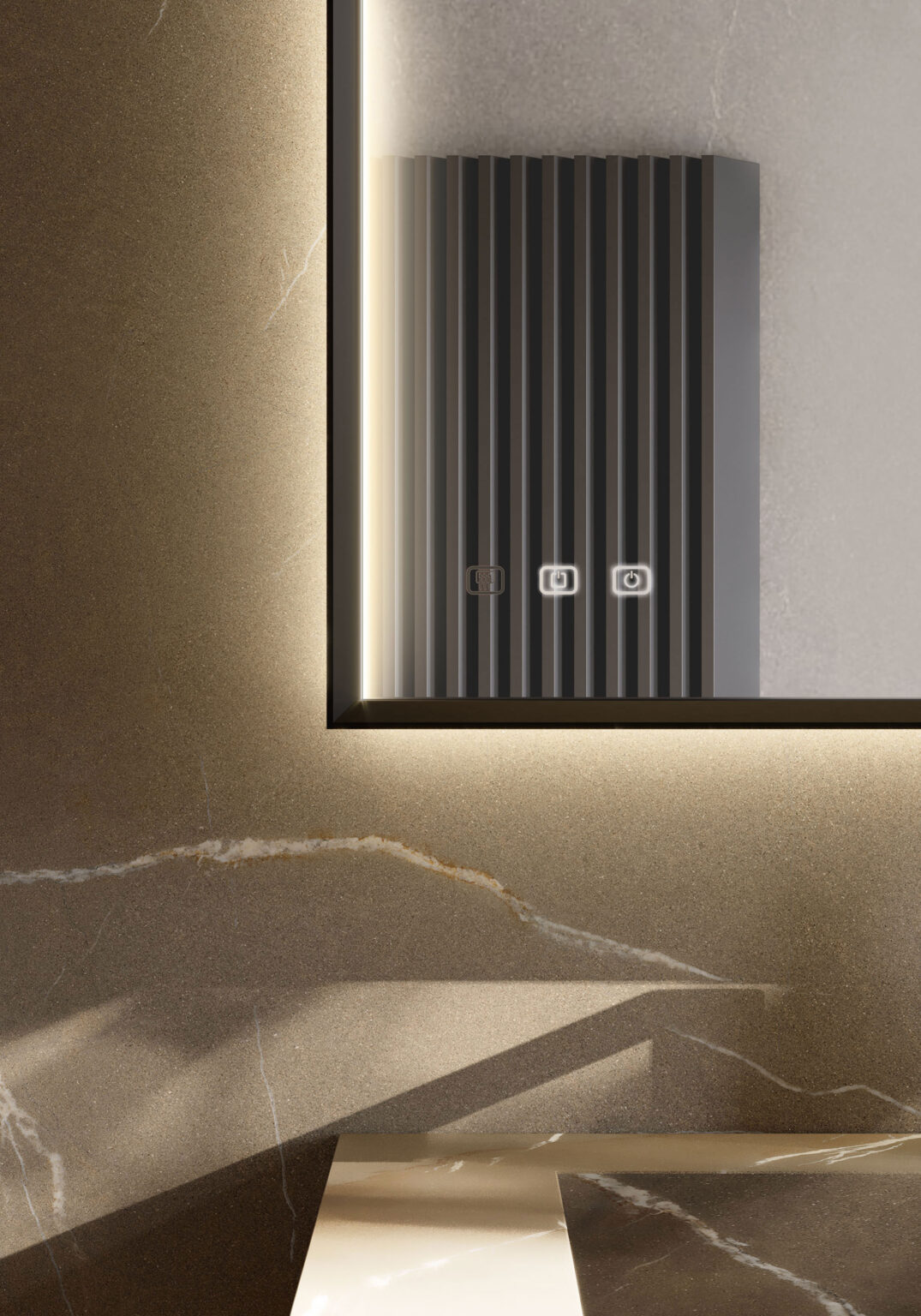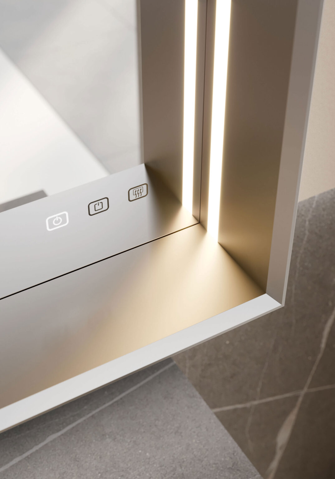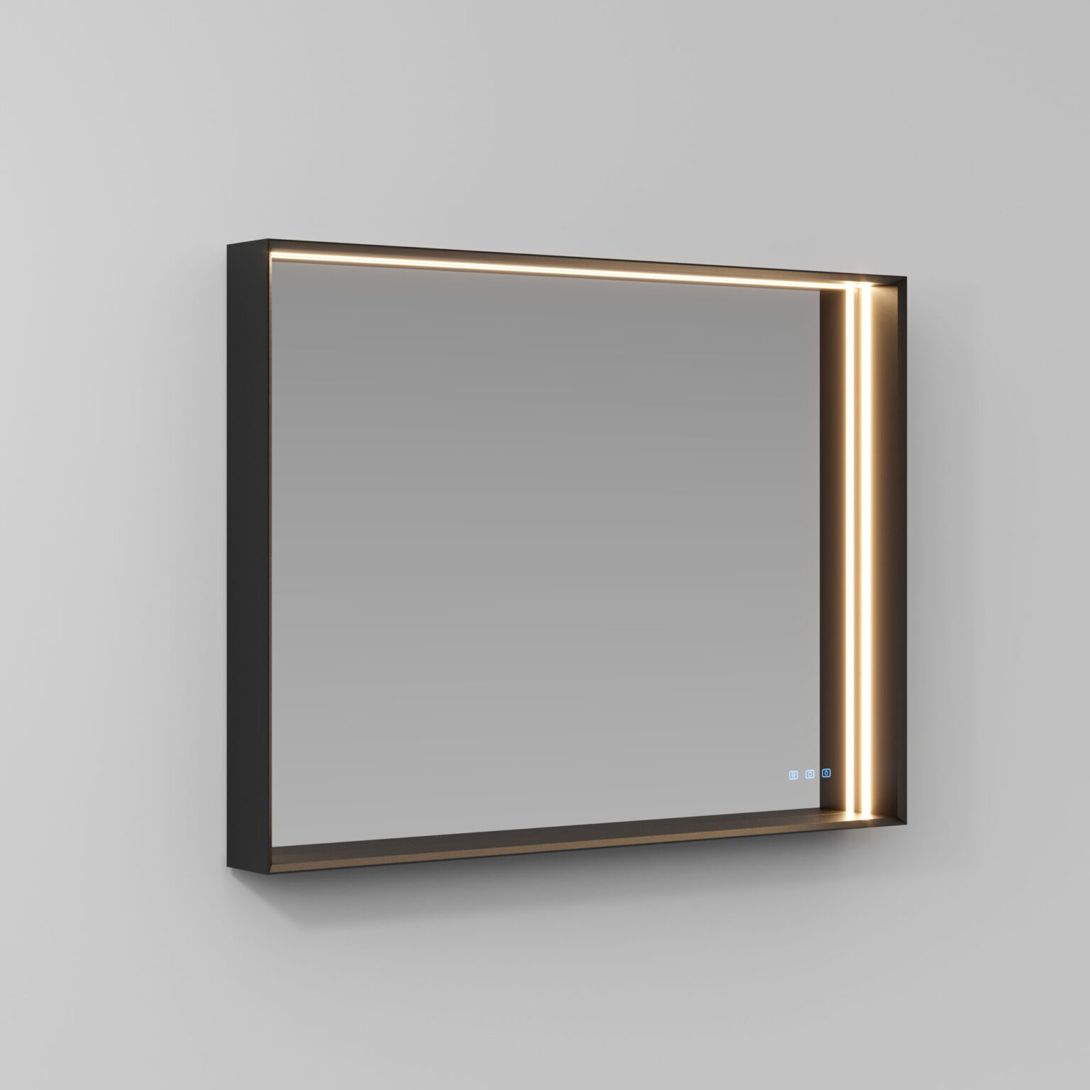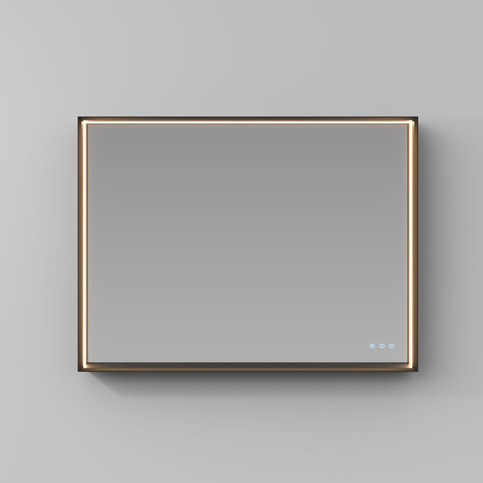 Зеркало Pigreco с алюминиевой рамой, встроенным светодиодным освещением с 3 сторон, системой защиты от запотевания с сенсорным управлением Touch on/off и системой смены интенсивности 2 700/4 000 К. Без возможности подключения розетки.
