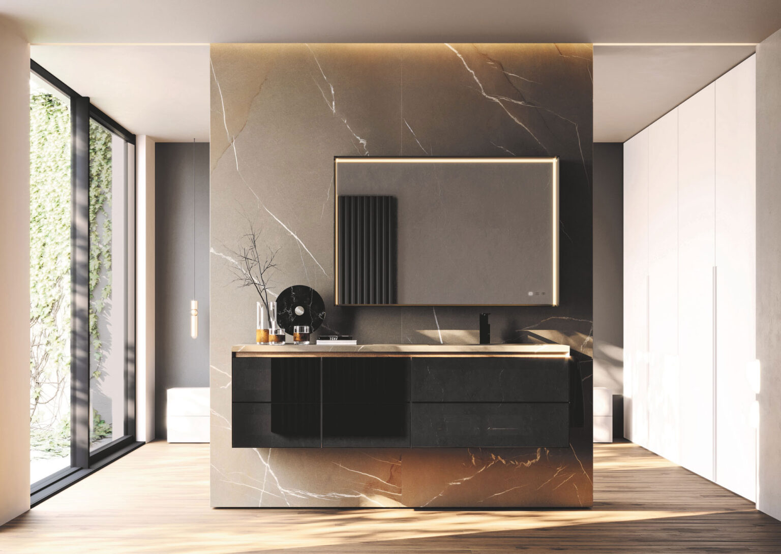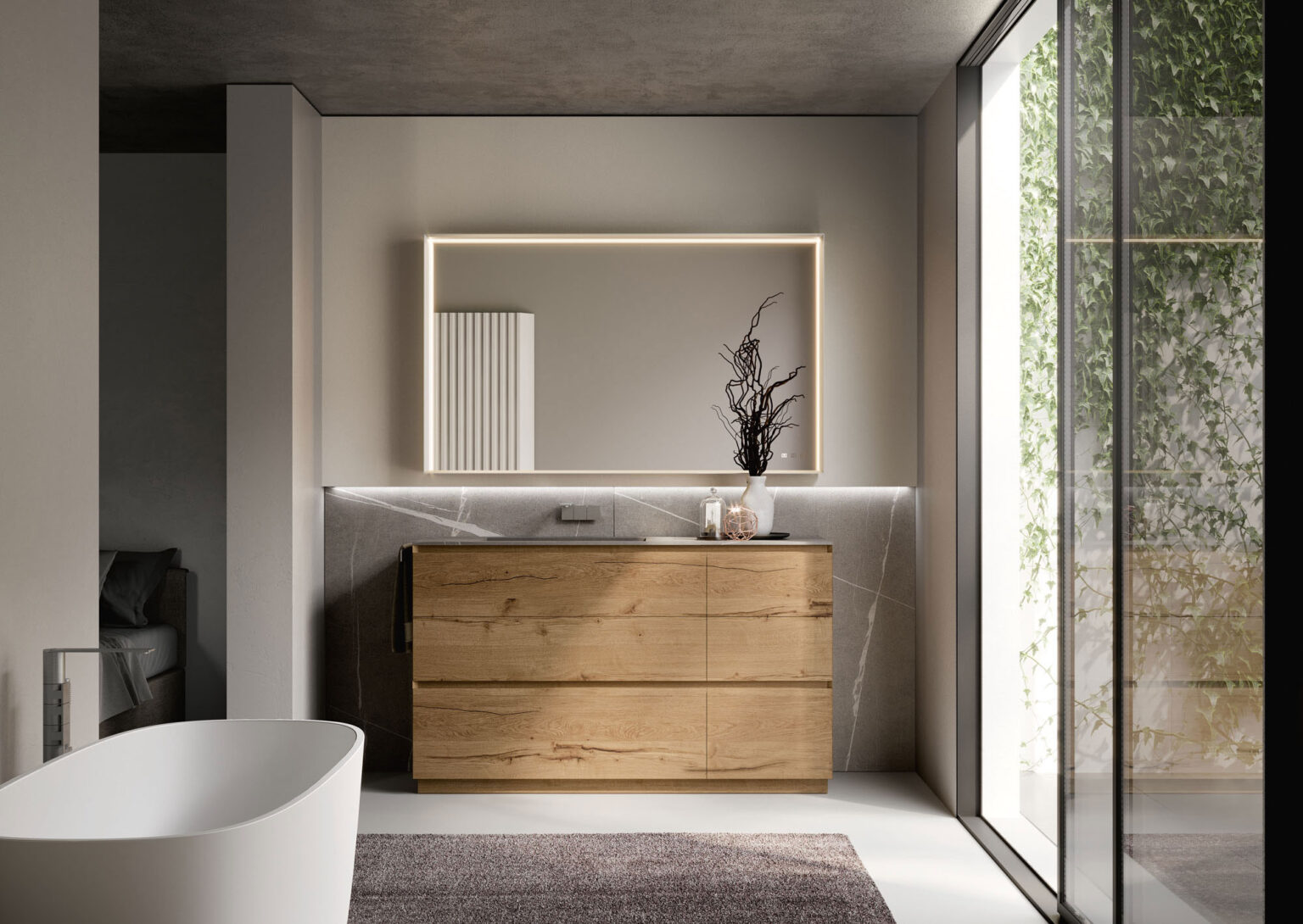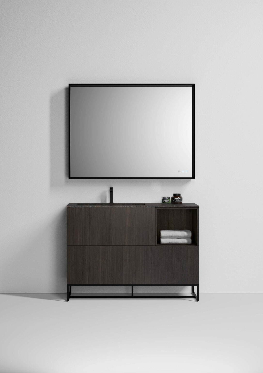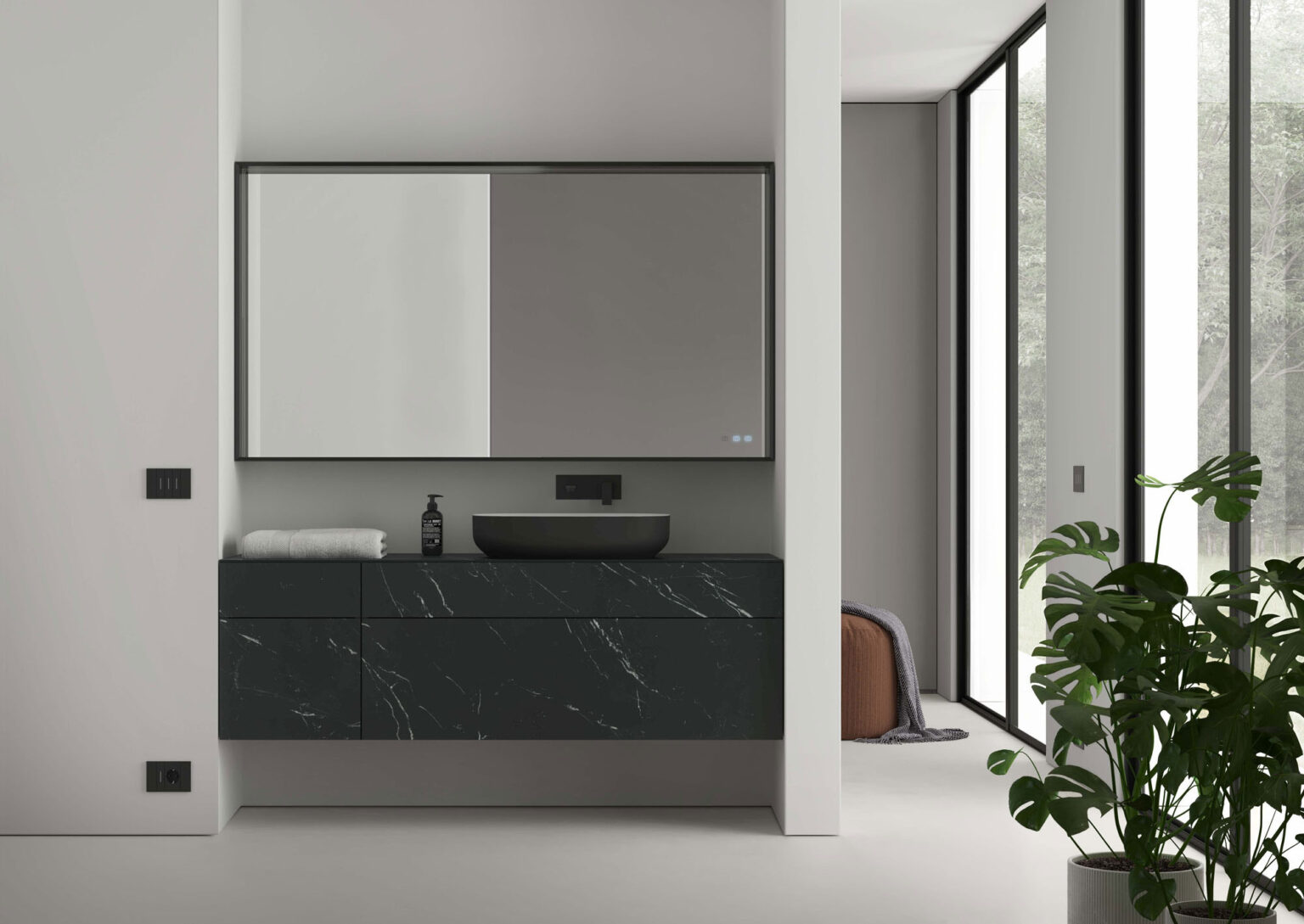 Зеркало Pigreco с алюминиевой рамой, встроенным светодиодным освещением с 3 сторон, системой защиты от запотевания с сенсорным управлением Touch on/off и системой смены интенсивности 2 700/4 000 К. Без возможности подключения розетки.