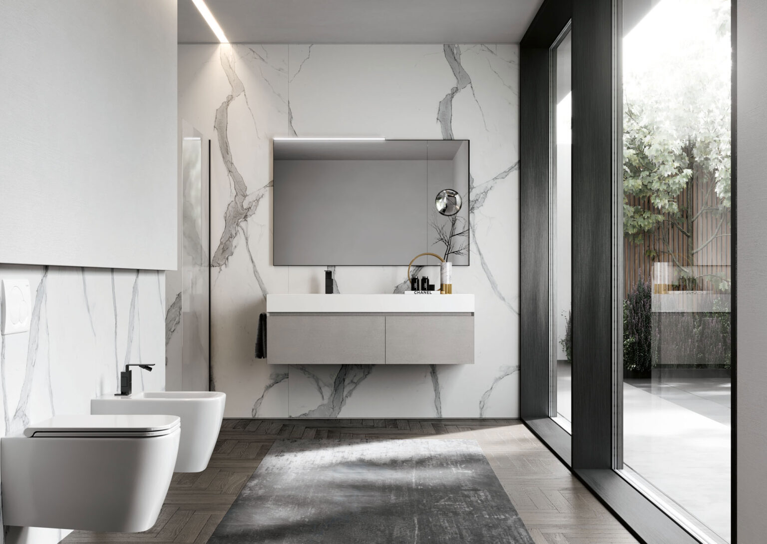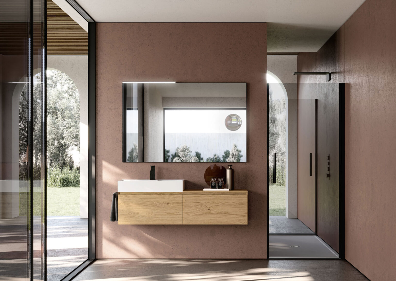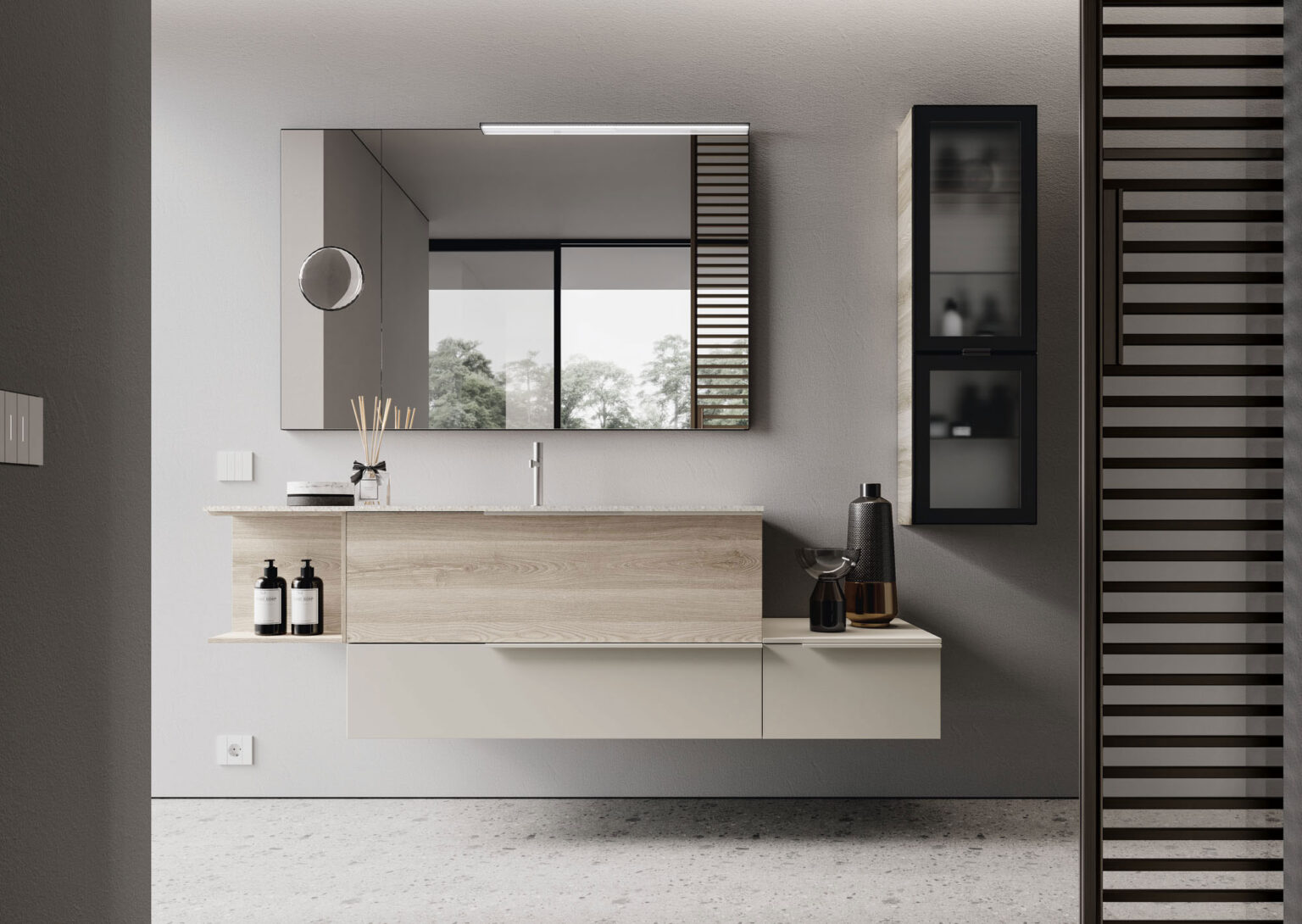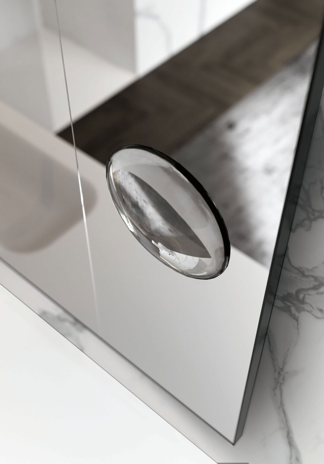 Можно дополнить стеклянными полками (толщина 1, глубина 12 см) или в отделке (толщина 1,2 см, глубина 12 см) c опорами из алюминия с хромированной отделкой или черного цвета для крепления непосредственно к зеркалу (без отверстий в стене).