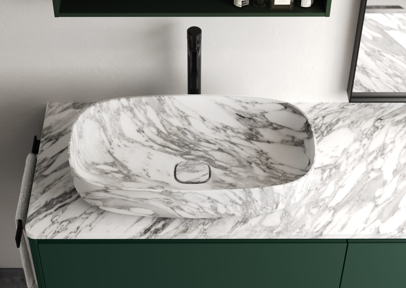 Накладная раковина Click из натурального мрамора. Без перелива, в комплекте с всегда открытым сливом в отделке. Доступна для линейеых столешниц глубиной 36 и 45,5 см.
