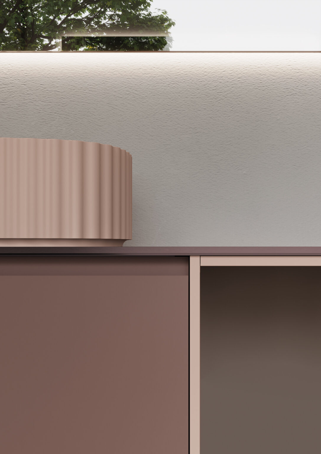Материал Cristalplant®, известный своей красотой. Он похож на натуральный камень с мягким на ощупь эффектом. В основном состоит из минеральных наполнителей из тригидратов алюминия высокой чистоты, связанных смолами Biobased® растительного происхождения (пщеница/кукуруза). Устойчивый, антибактериальный, поскольку он является фотокаталитическим, восстанавливается от царапин, ударов и пожелтения в течение длительного срока службы, пригоден для вторичной переработки в конце срока службы.
