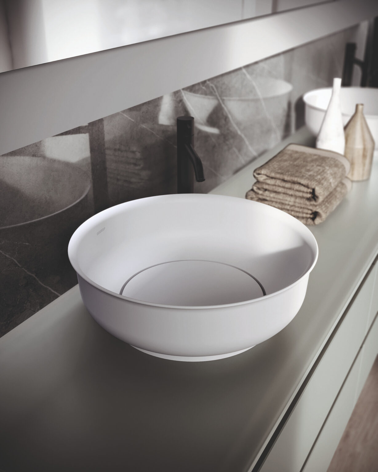 Накладная раковина Nicole Tondo из белого Mineralux и белого Mineralsolid, без перелива, в комлекте с постоянно открытым сливом в отделке. Поставляется для линейных столешниц глубиной 36 и 45,5 см, а также для изогнутых столешниц.