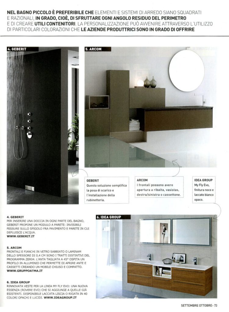 Коллекция My Fly Evo, отледка Noce в журнале 100Idee per Ristrutturare — № 9/2011 Мебель для ванных комнат коллекции My Fly Evo, отледка noce и laccato bianco opaco, в статье, посвященной мебели для ванных комнат, которые сочетают конструктивные объемы с особенными оттенками цвета.