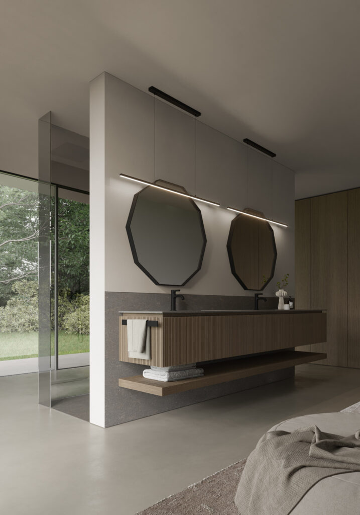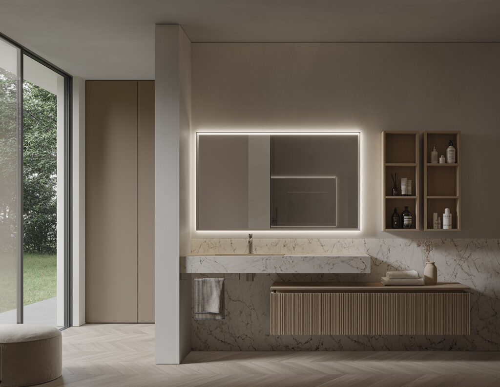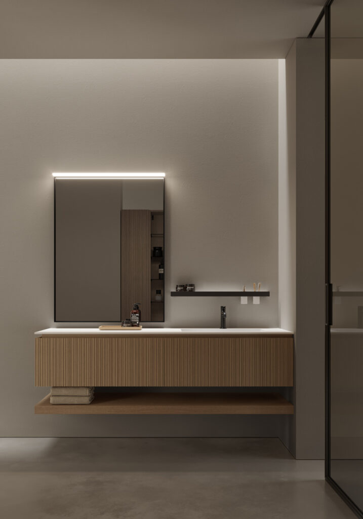 ViaCondotti предлагает мебель для ванных комнат с изысканным дизайном. Мебель коллекции отличается эксклюзивным вертикальным движением фасадов и боковин, создавая динамичный и современный эффект.