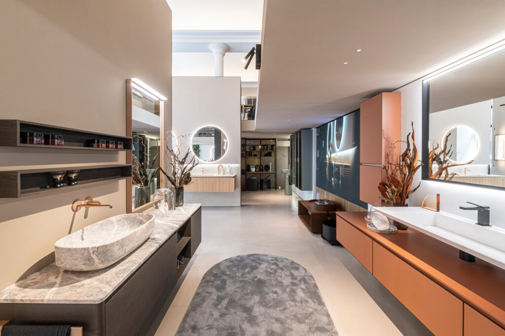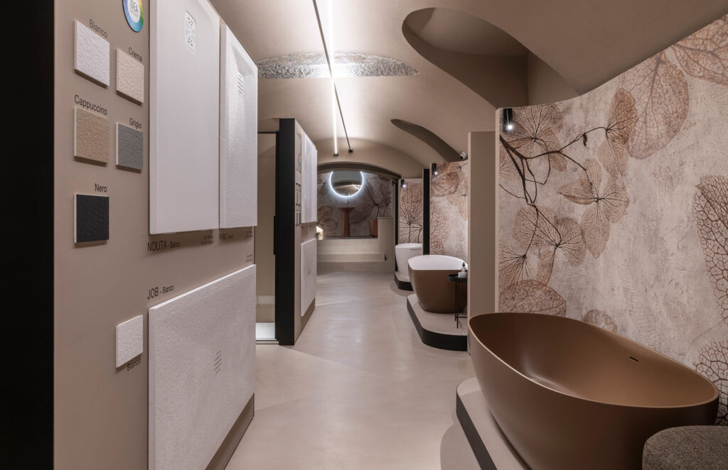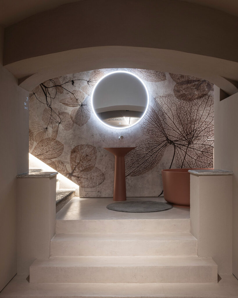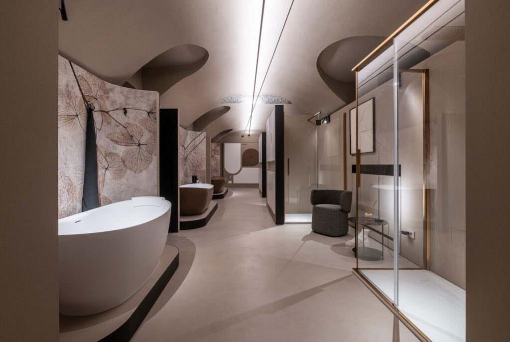 Белый, черный и голубовато-серый — нейтральные цвета, выбранные для того, чтобы заставить среду говорить и создавать впечатляющую сценографию, которая усиливает объемы и четко выраженную трехмерность пространств, а также материал — и его многочисленные отделки — который обретает форму в решениях, посвященных здоровому образу жизни. Эмоциональное место, подчеркивающее потенциал решений Ideagroup: от мебели для ванных комнат до душевых кабин и поддонов, от отдельно стоящих ванн до мини- бассейнов для оздоровительного сектора.