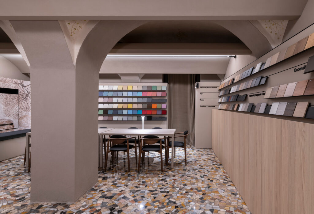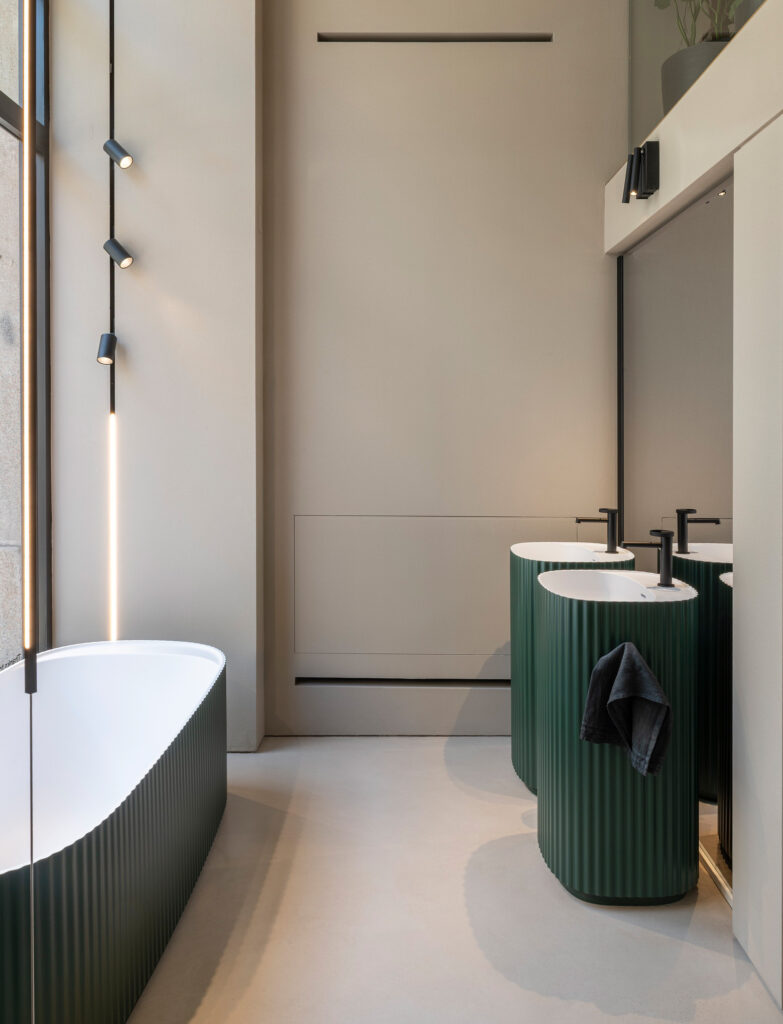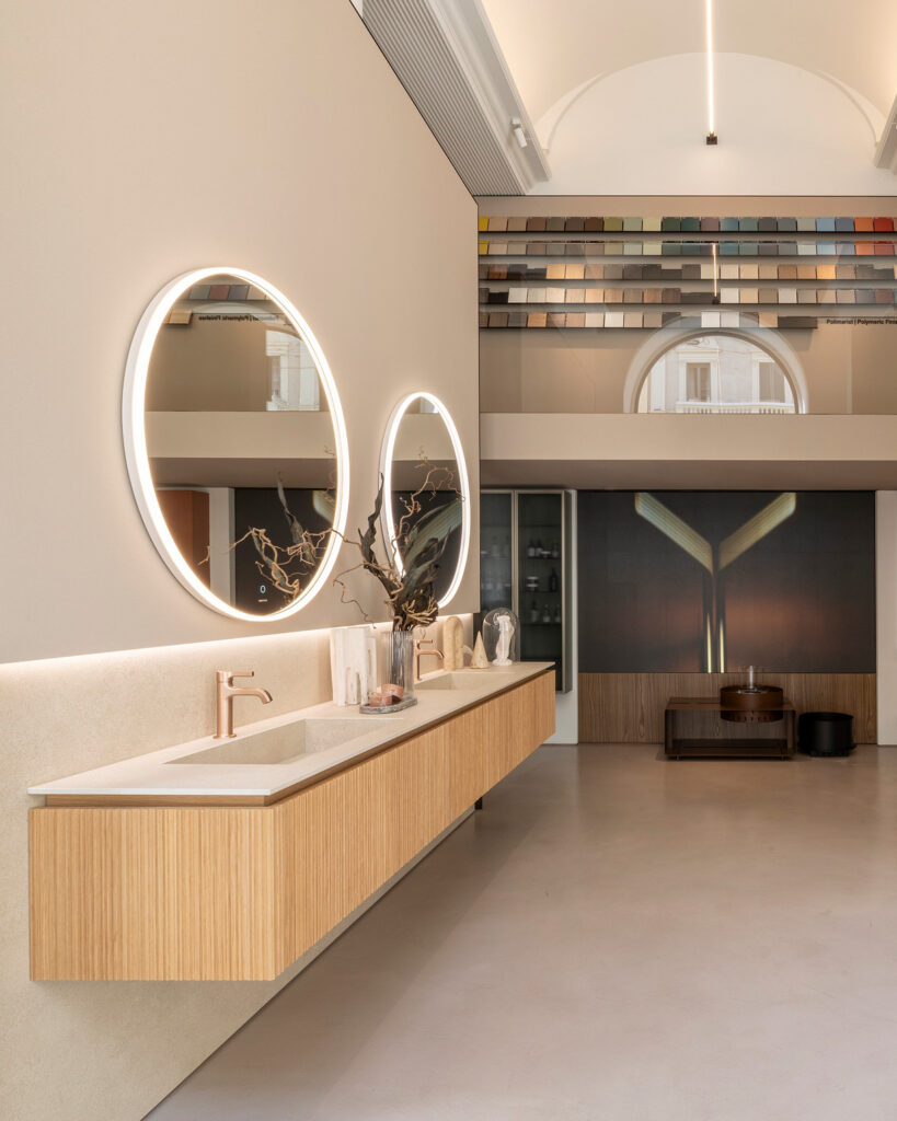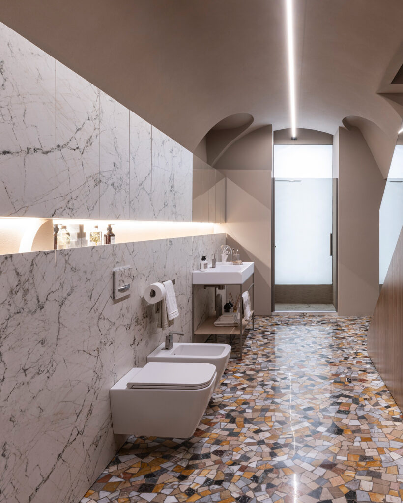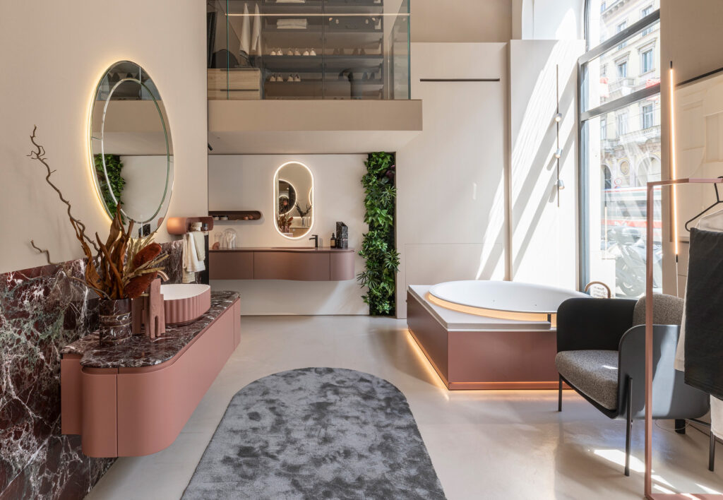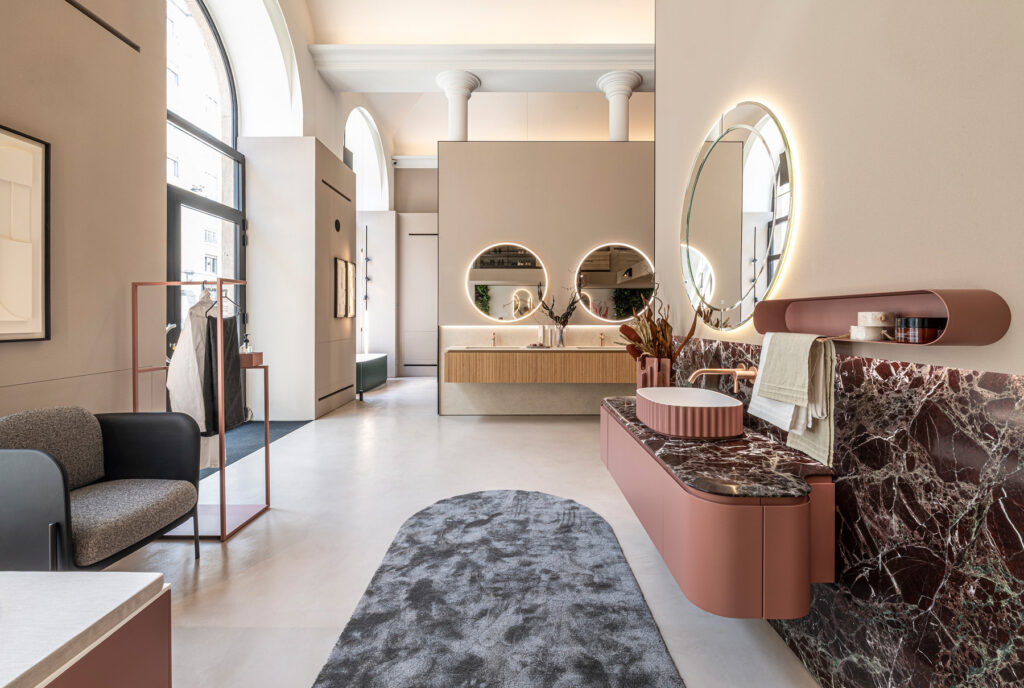 «Spazio Milano» – выставочный зал Ideagroup расположен в нескольких шагах от Бреры и предназначен для архитекторов и дизайнеров, которые ищут вдохновение для обустройства современных ванных комнат и помещений, посвященных здоровому образу жизни. Выставочный зал расположен на первом этаже одного из самых красивых исторических зданий на улице Виа Манцони. Исходя из существующих объемов и архитектурных особенностей места, Риккардо Гава (арт-директор бренда) спроектировал Spazio Milano площадью более 300 квадратных метров, расположен на трех уровнях.