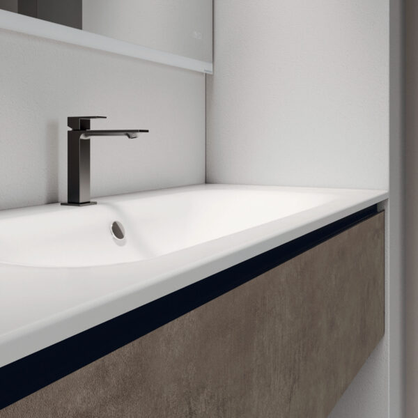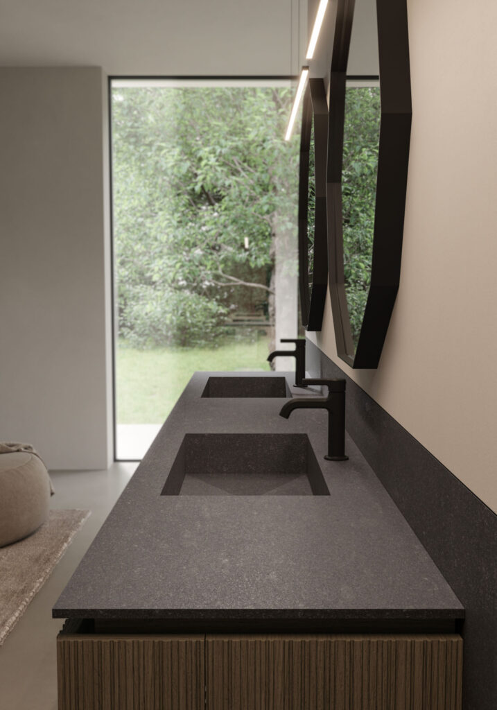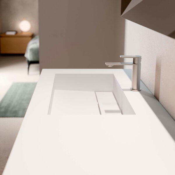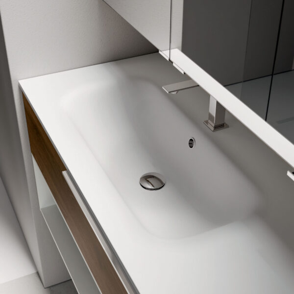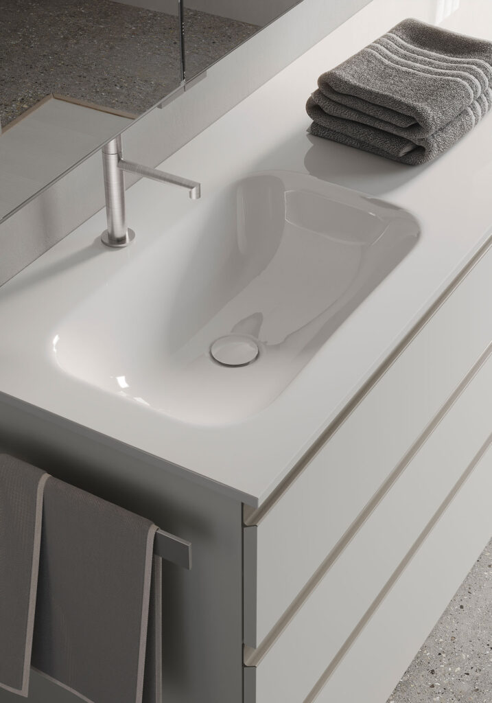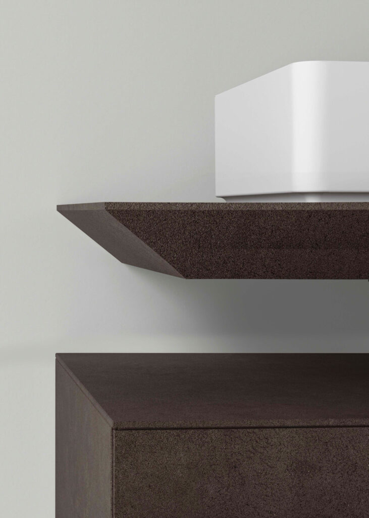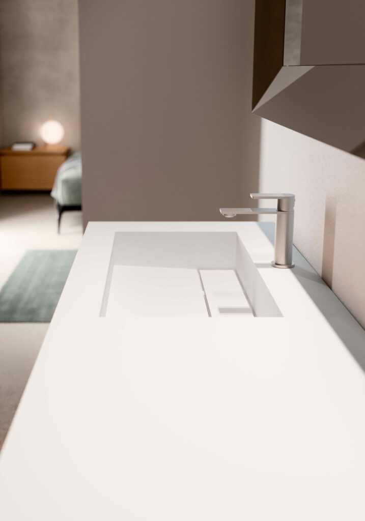 Столешницы duplex состоят из поверхности HPL и раковины Mineralsolid. Они доступны толщиной 1,2, 6 и 12 см. HPL – это материал превосходного качества с точки зрения его функционального и эстетического потенциала. Он устойчив к износу и воде, гигиеничен и универсален в обработке, сохраняет свои эстетические характеристики и эксплуатационные характеристики неизменными на протяжении всего срока службы. Внутри он состоит из слоев целлюлозных волокон, пропитанных фенольными смолами, а снаружи – из одного или нескольких слоев целлюлозных волокон с эстетической функцией, пропитанных термореактивными смолами и соединенных вместе методом высокого давления в соответствии со стандартом EN 438:2005. Особая компактность HPL обеспечивает устойчивость к изгибу, растяжению, сжатию и ударам. Раковина изготовлена из материала Mineralsolid. Гелькоутная пленка (800-1000 мкм), покрывающая поверхность материала, представляет собой акрилатный полиэстер и придает матовую поверхность. Особенностью данного покрытия является возможность восстановления поверхности, подобно изделию Solid Surface.