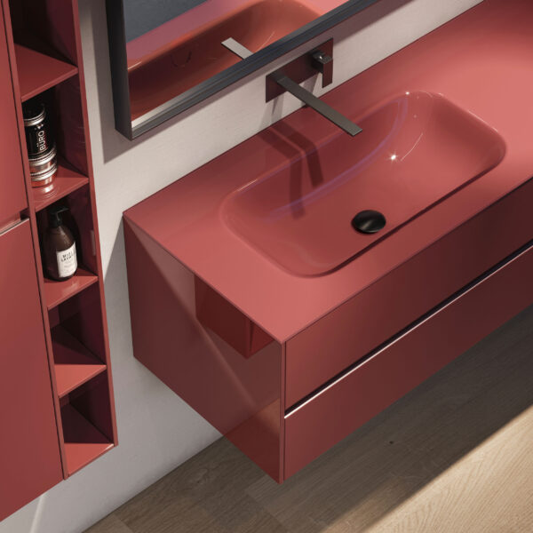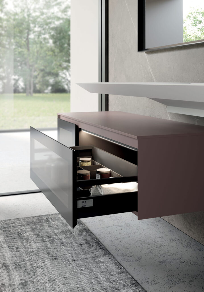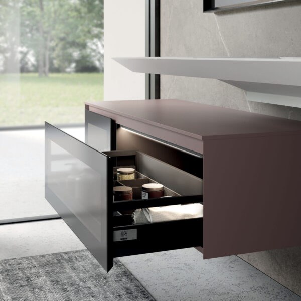 Стеклянные столешницы толщиной 1 см из сверхпрозрачного стекла доступны в цветовых вариантах Ideagroup и в двух вариантах отделки: глянцевой и матовой с кислотным травлением.