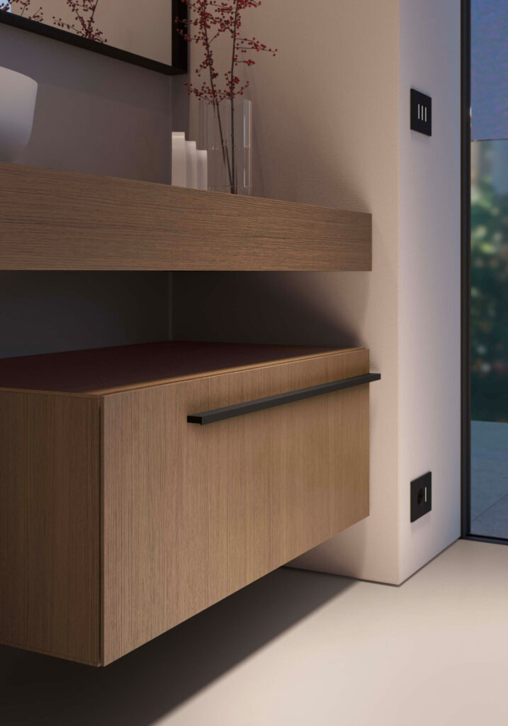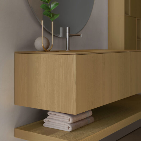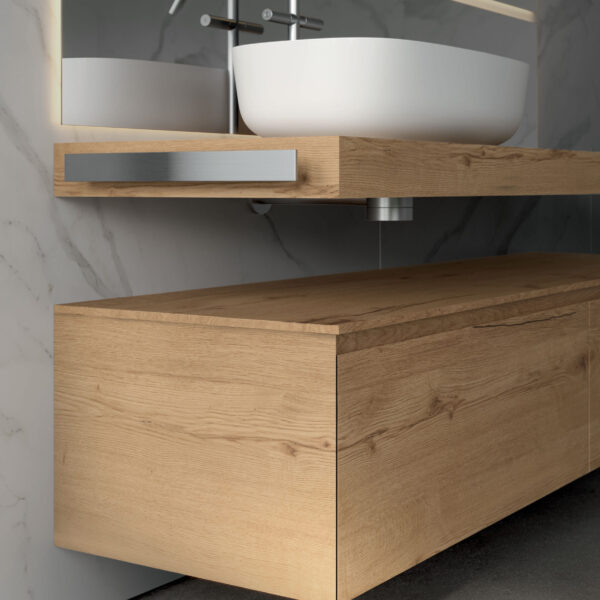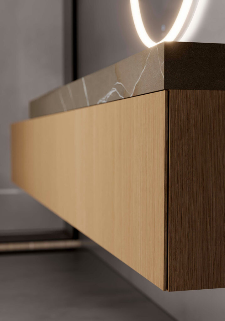 Шпонированные столешницы изготовлены из панелей CARB P2 и TSCA title VI толщиной 1,2, 6 (цельные) и 12 см (коробочные) и облицованы листом натурального дерева. Эта отделка относится к числу самых ценных материалов, придающих мебели тот естественный вид, который может дать только настоящее дерево. Шпон обработан защитными лаками на водной основе для защиты от пыли и поверхностных пятен.