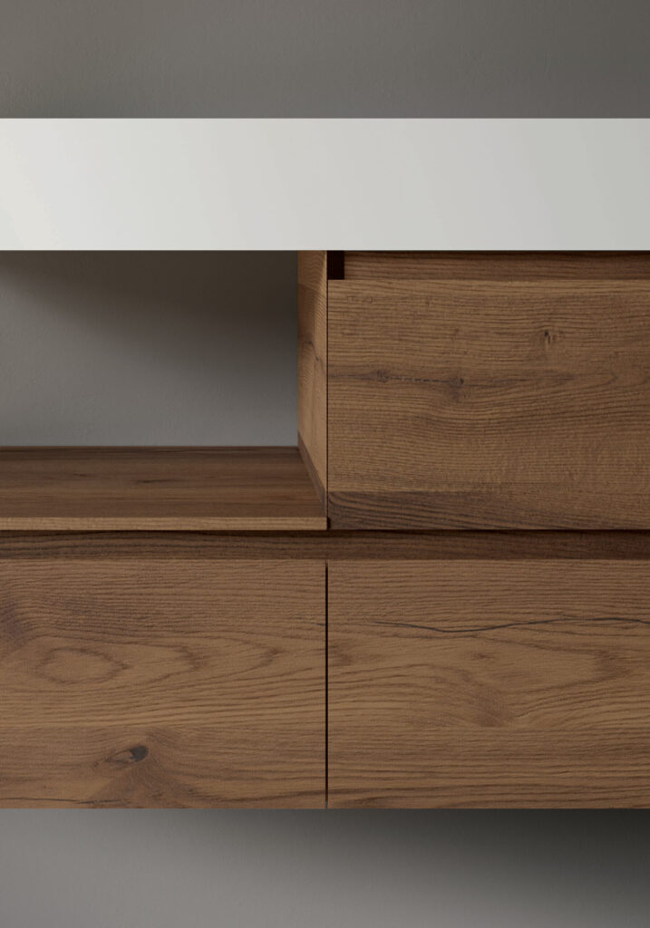 Панели CARB P2 и TSCA title VI облицованы листом натурального дуба. Эта отделка относится к числу самых ценных материалов, придающих мебели тот естественный вид, который может дать только настоящее дерево. Шпон обработан защитными лаками на водной основе для защиты от пыли и поверхностных пятен.
