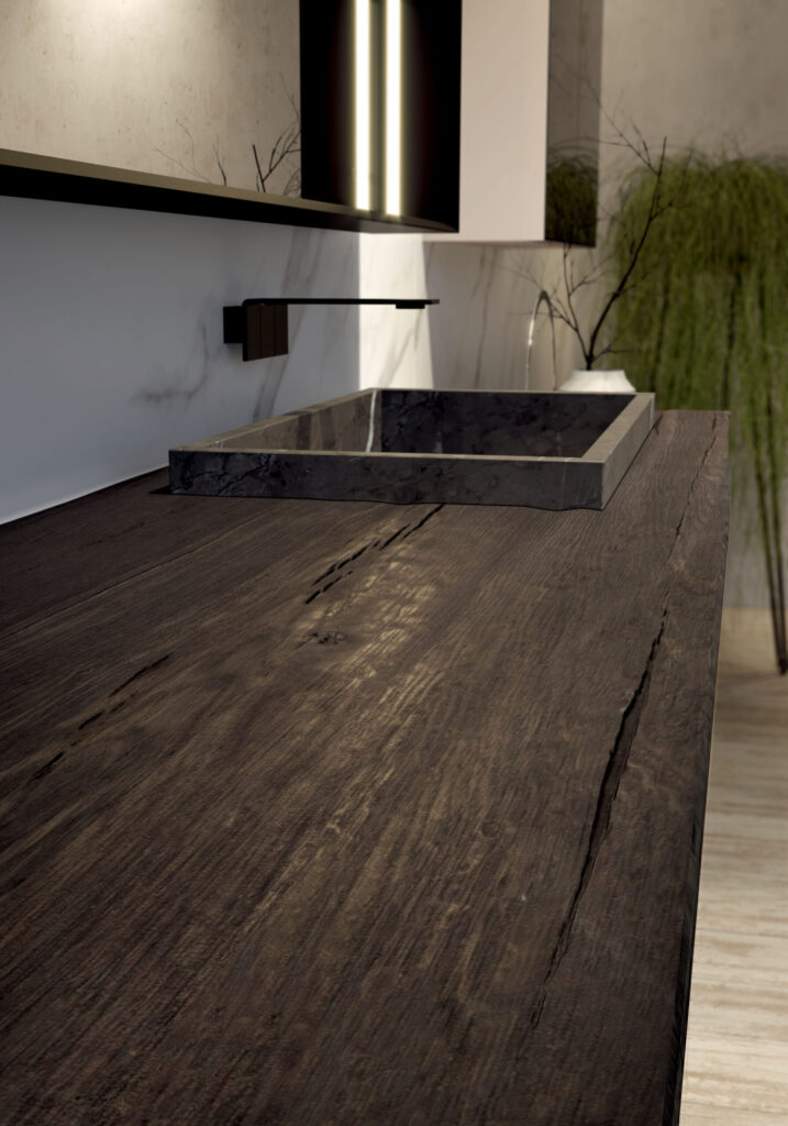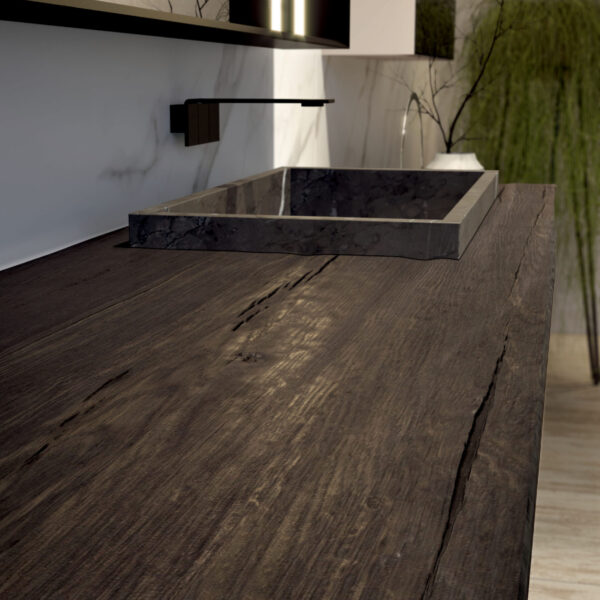 Уникальность ископаемой древесины подчеркивается тем фактом, что ее запасы нелегко достать. Добыча ограничена лишь несколькими районами юго-восточной Европы. Это стволы деревьев, найденные в болотах, реках или озерах, залегающие на глубине нескольких метров. Течение, глубина воды и качество почвы играют особую роль в структурной консолидации ствола, поскольку подземные потоки связывают минералы и железо с дубильными веществами древесины. В этом состоянии древесина не разлагается и не гниет, она просто каменеет и превращается в лигнит, приобретая большую твердость и прочность. Предполагаемый возраст ископаемой древесины, используемой для наших столешниц, составляет около 4000/5000 лет. После извлечения ископаемый ствол подвергается сушке. Результат не всегда идеален для обработки (форма, цвет и недостатки), поэтому бревна, используемые для этой цели, представляют собой редкий выбор качества.